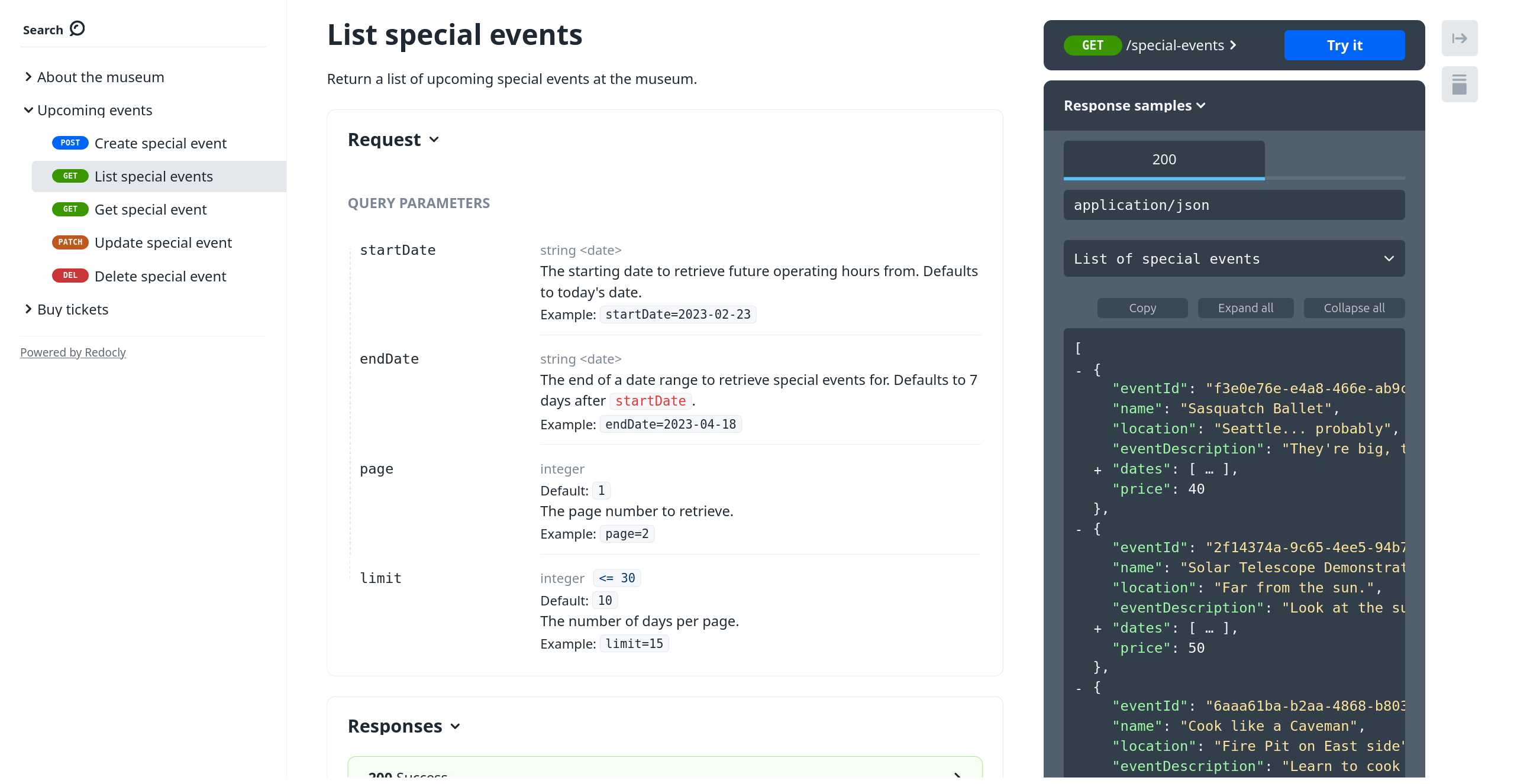 description: Museum tickets for general entrance or special events.Each endpoint has the tag or tags that relate to it. Still with the museum example, here's the first few lines of the endpoint that returns a list of special events going on at the museum: