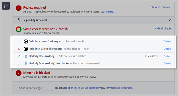 - Using validation checks for broken links (Redocly has a broken link checker), style and language tools such as Vale.