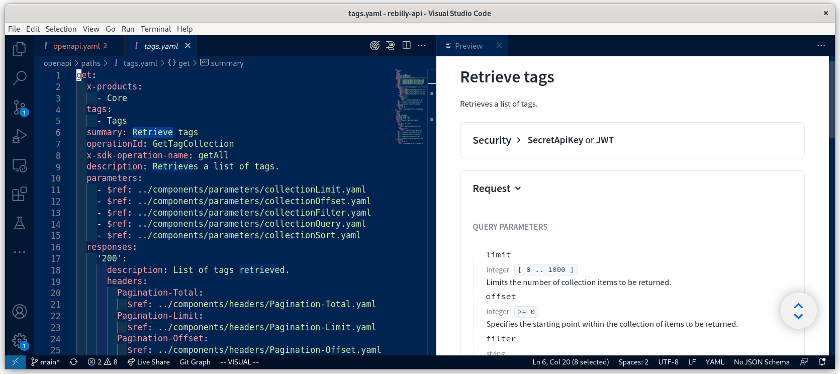 - Redocly extension is yaml-aware and openapi-aware, and generally keeps me on the right track by checking I'm writing valid formats, and identifying problems.