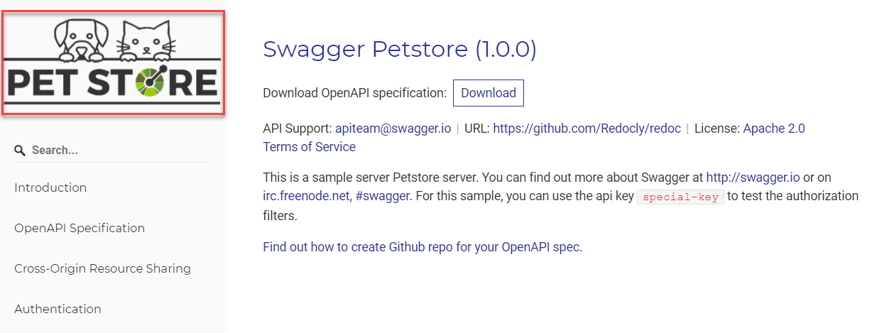 When specified, the logo image is displayed above the navigation sidebar, on the left side of the API documentation page.